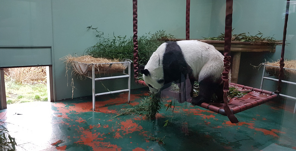 The first thing that struck me was how small they actually were! You see Giant pandas in videos on the internet all the time and they look quite large, not only that but their name is a pretty solid indicator that they're, well, giant! I was a little shocked when I saw them and realised that I've probably seen bigger teddy bears up for grabs at my local fairground that turns up a few times a year. I then spent what must have been at least a full 10 minutes just looking through the glass at them in silence, just complete and utter awe at these beautiful creatures. Tian Tian (which means 'Sweetie'), the female panda spent the majority of our visit asleep on her bed, moving only to get herself into a more comfortable position. She looked so peaceful and content. On the other side, the male named Yang Guang (which means 'Sunshine') was happily munching away on his bamboo breakfast. It was incredible to see both pandas in such different states, to be able to obverse what they're like when they're both active and inactive. It was truly a treat and a memory that will stay with me forever.